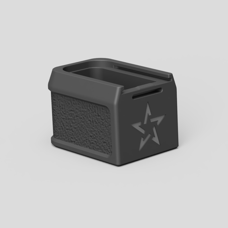 Stopka magazynka Staccato 2011 9mm. Przedłuża magazynek o ~20mm w celu sprawniejszej obsługi. Montowana w miejsce oryginalnej. Dwie wersje do wyboru: Zwiększająca ilość ładowanego ammo – +3 Samo przedłużenie, bez możliwości ładowania dodatkowej ammo UWAGA! Stopka +3 ammo wymaga wymiany sprężyny na dłuższą! Wykonano w technologii druku 3D z PETG-CF (Carbon Fiber).