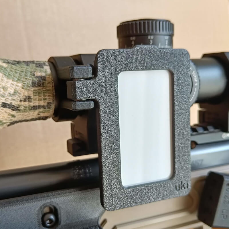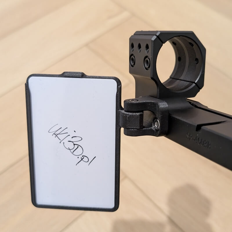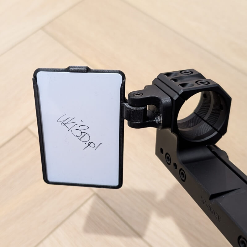 Montowany na tubus lunety lub do montażu SPUHR i odchylany na boki. W holderze biała karta (Zebra) o wymiarach takich jak karta bankomatowa, czysta.