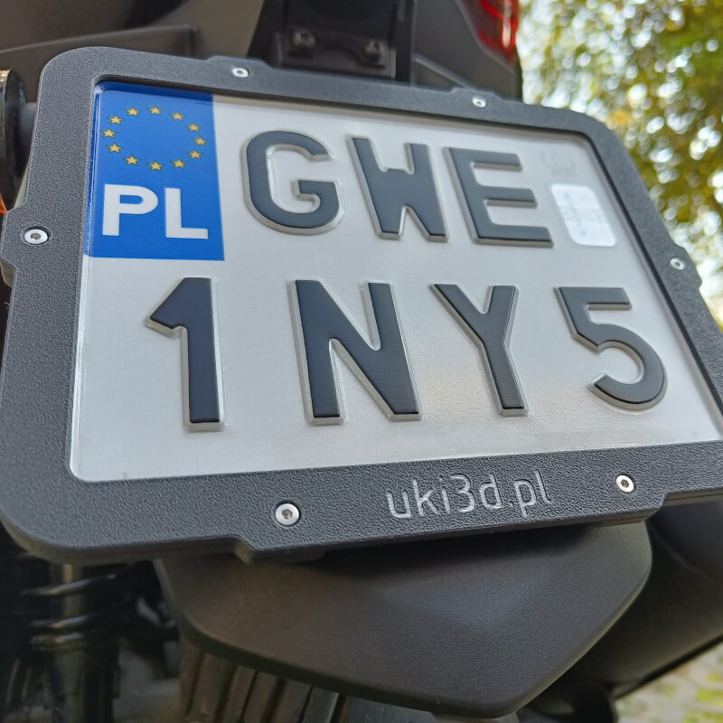 Ramka tablicy rejestracyjnej do skutera lub motocykla. Ramka składa się z dwóch części, skręcanych ze sobą za pomocą 6 śrub M3 oraz nakrętek samohamownych. Montaż do stelaża skutera – dwie śruby M5 z poszerzonymi podkładkami. Regulacja montowania w poziomie. Wszystkie elementy złączne ze stali nierdzewnej. Tablica osiada na specjalnych żłobieniach w ramce – idealne dopasowanie bez telepania!